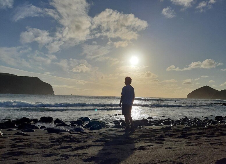 Sete Cidades es la estrella de la gira oeste. Maravíllate con los icónicos Lagos Azul y Verde, enclavados en un cráter volcánico, y disfruta de vistas panorámicas desde miradores como Vista do Rei. Explore el pueblo del cráter y admire la iglesia neogótica de São Nicolau, luego detente en el Miradouro do Escalvado, que ofrece vistas espectaculares sobre el Ilhéus dos Mosteiros y el pintoresco pueblo costero de Mosteiros. A lo largo del recorrido panorámico, se sorprenderá con las majestuosas formaciones rocosas de lava de la isla y la exuberante campiña. No te pierdas la Lagoa do Fogo, una de las lagunas más prístinas y protegidas de São Miguel, solo accesible sin autos de alquiler, haciendo de esta visita guiada la manera ideal de visitar este tesoro natural.