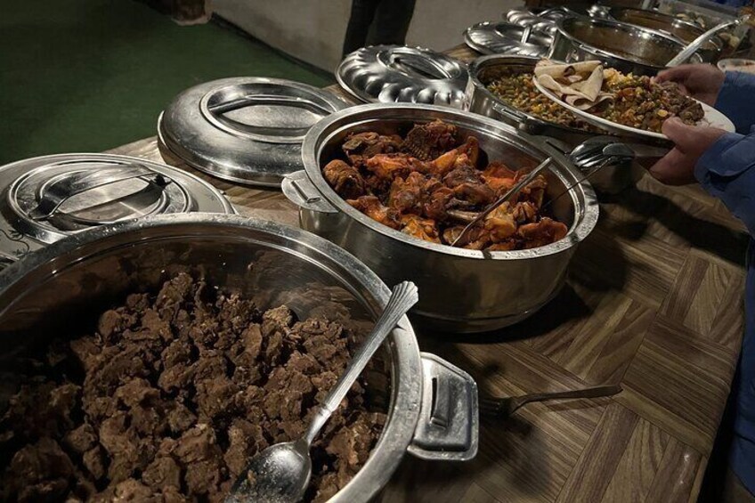 Cena y desayuno: La cena buffet y el desayuno se sirven en la tienda beduina. Las opciones son platos vegetales y no vegetales.